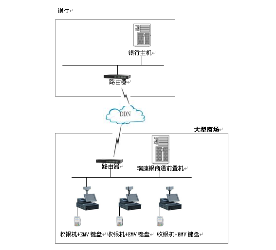 在本方案中通過(guò)在商戶收銀機(jī)上外接EMV密碼鍵盤(pán)或POS即可實(shí)現(xiàn)銀行卡受理,交易由商戶收銀系統(tǒng)發(fā)起,在EMV鍵盤(pán)或POS上完成銀行卡收單交易數(shù)據(jù)的采集,通過(guò)商戶內(nèi)部網(wǎng)絡(luò)經(jīng)由商戶與銀行的專(zhuān)線將銀行卡交易數(shù)據(jù)上送銀行處理,銀行處理完成后將交易數(shù)據(jù)返回到EMV鍵盤(pán)或POS終端,終端將把交易的結(jié)果反饋給商戶收銀系統(tǒng)完成交易。